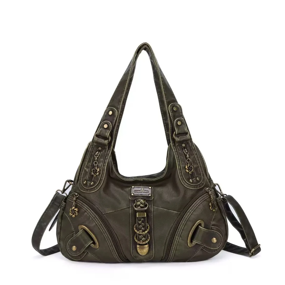 Its unique watermelon shape adds a playful touch to this classic moto bag design.